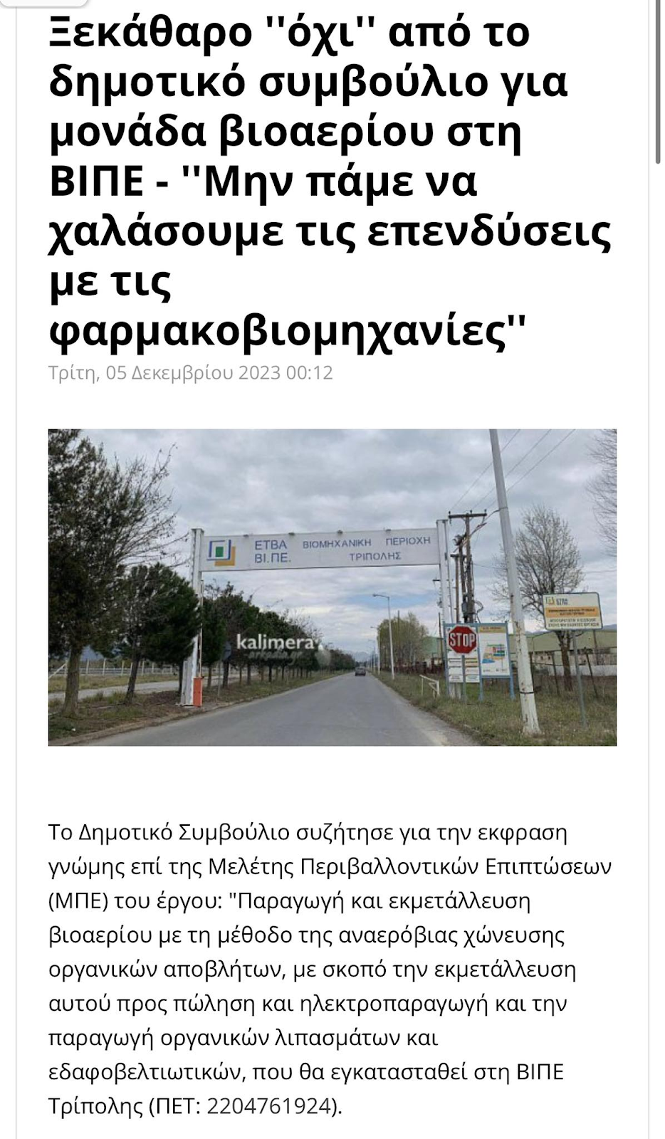 Εδώ και μερικούς μήνες, η πόλη και ιδιαίτερα ο επιχειρηματικός κόσμος της ΒΙ.ΠΕ. αλλά και τα πέριξ αυτής χωριά. είναι ανάστατοι για την ΒΟΜΒΑ που έσκασε (δεν γνωρίζουμε με ποιον ακριβώς τρόπο και από ποια παπαγαλάκια της διάχυσης πληροφοριών) πως υπάρχει εταιρεία που έχει αγοράσει ακίνητο στην ΒΙ.ΠΕ Τρίπολης και θέλει να κατασκευάσει μονάδα ΒΙΟΑΕΡΙΟΥ !!!!